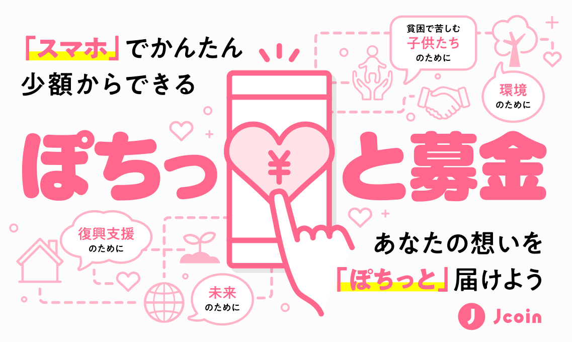 スマホ決済アプリ「J-Coin Pay」のサービスのひとつである「ぽちっと募金」からのご寄付です。寄付額は100円から、ご自身で設定いただけます。